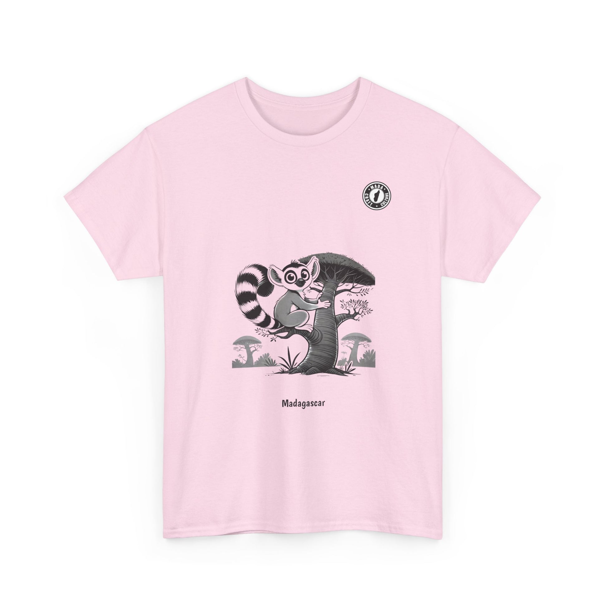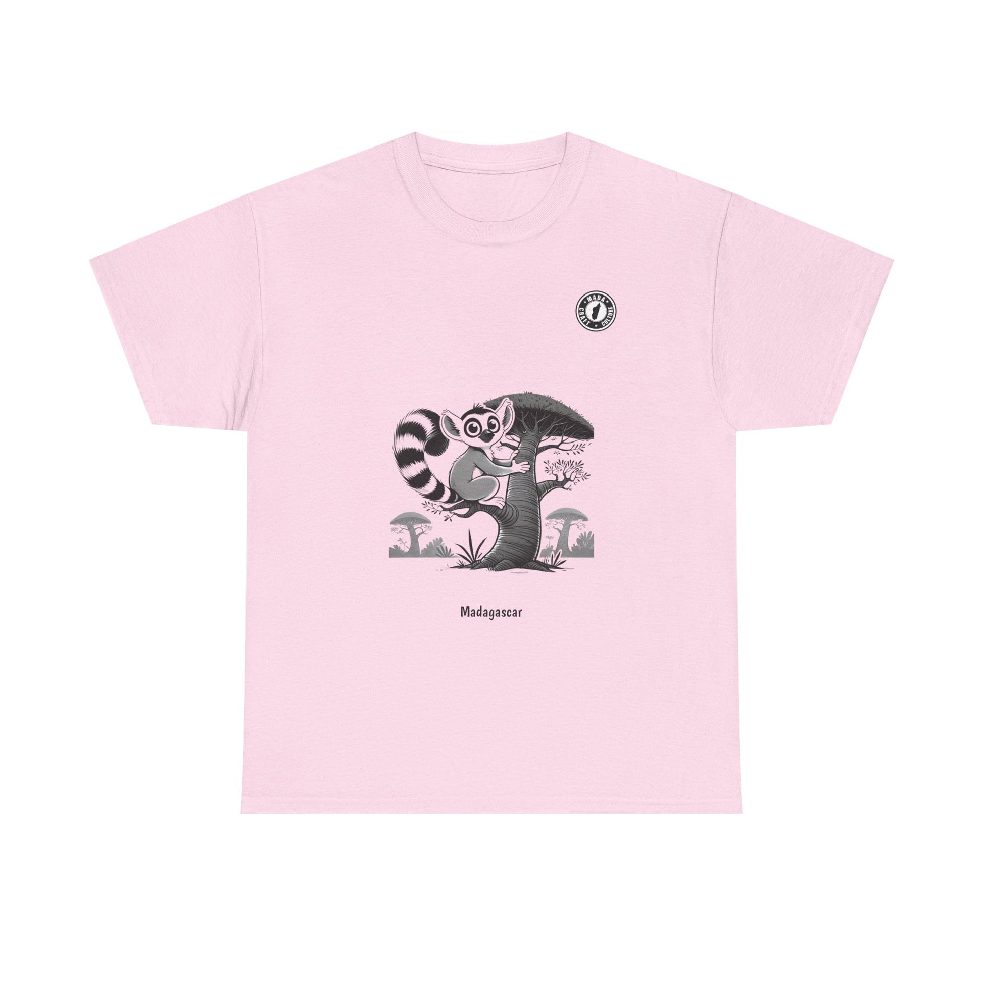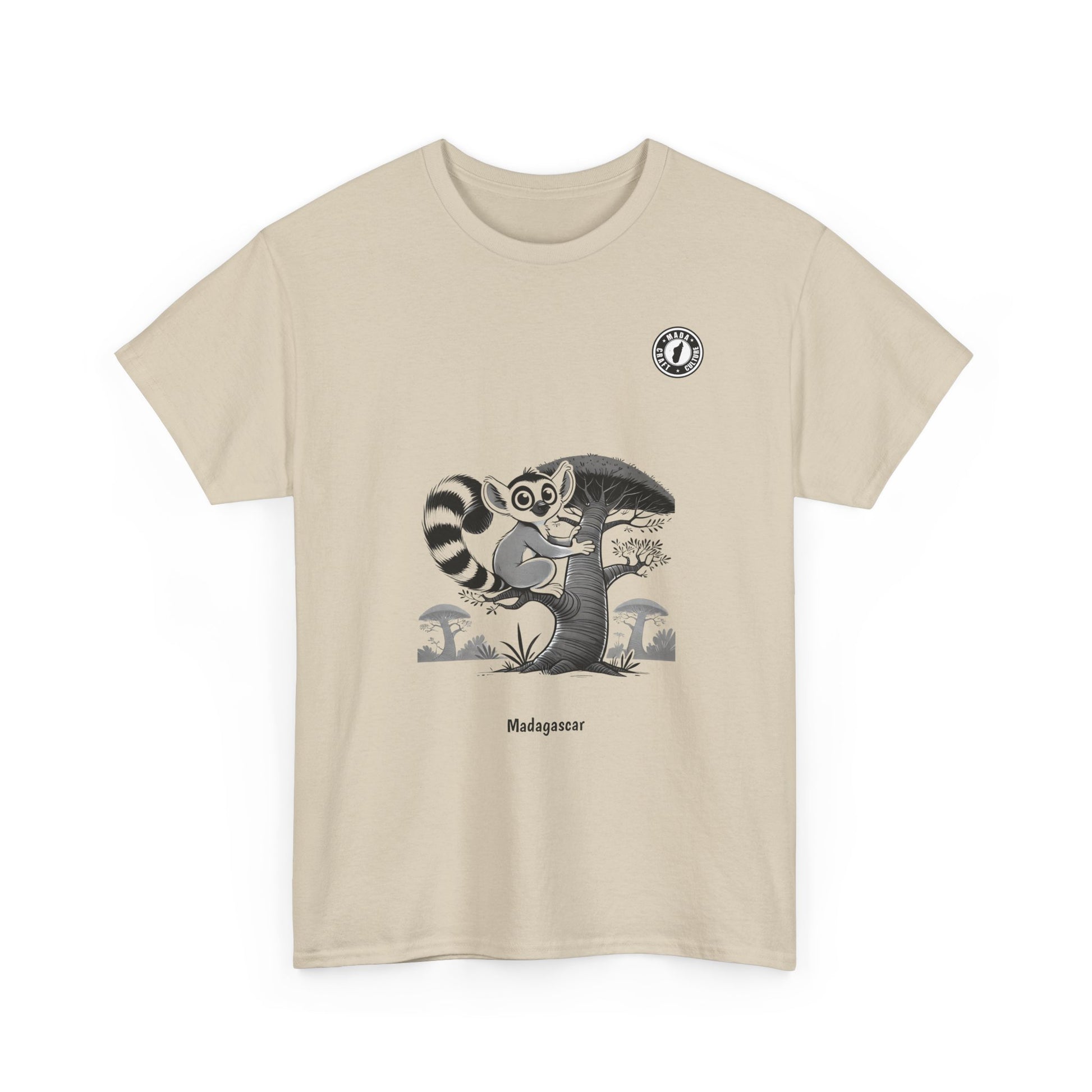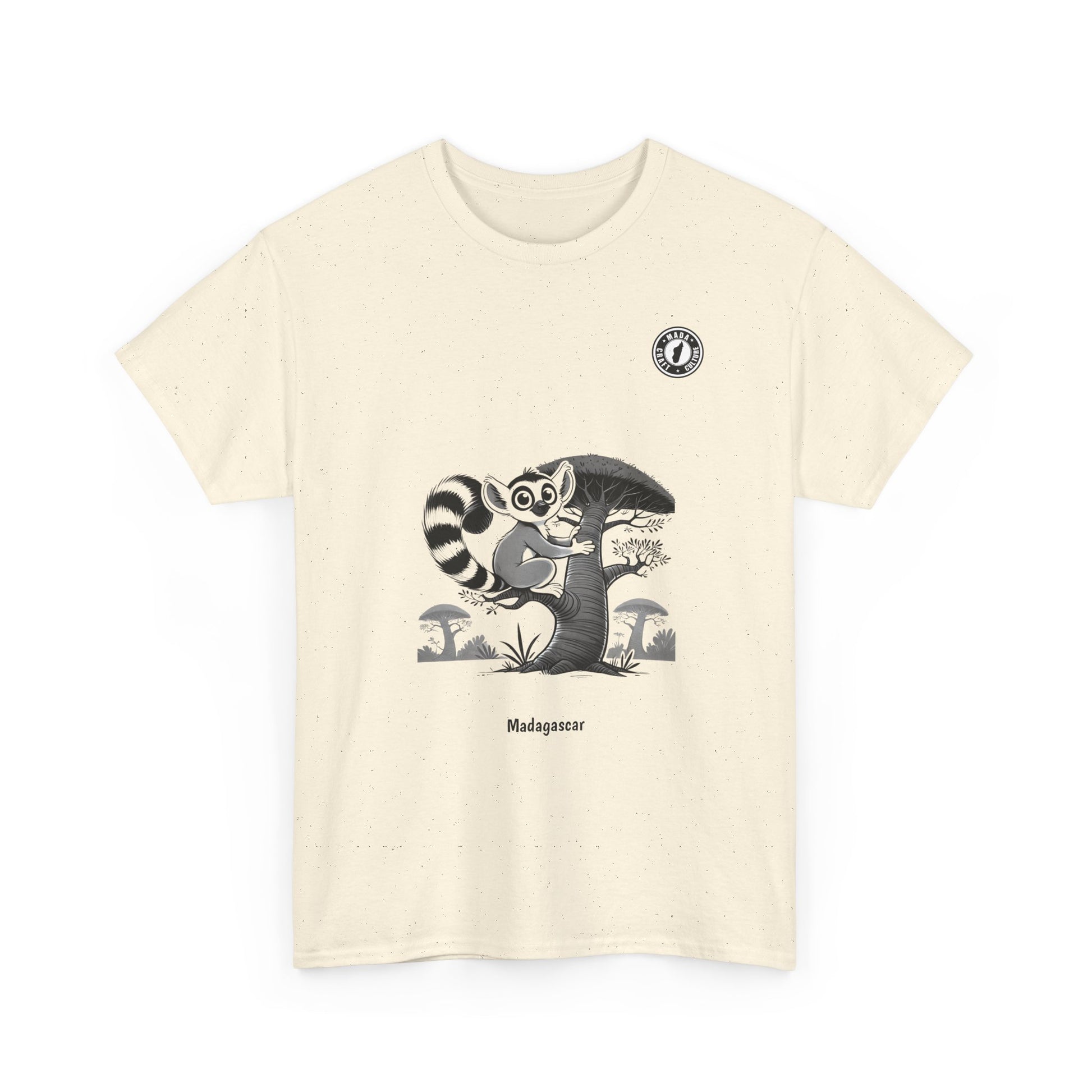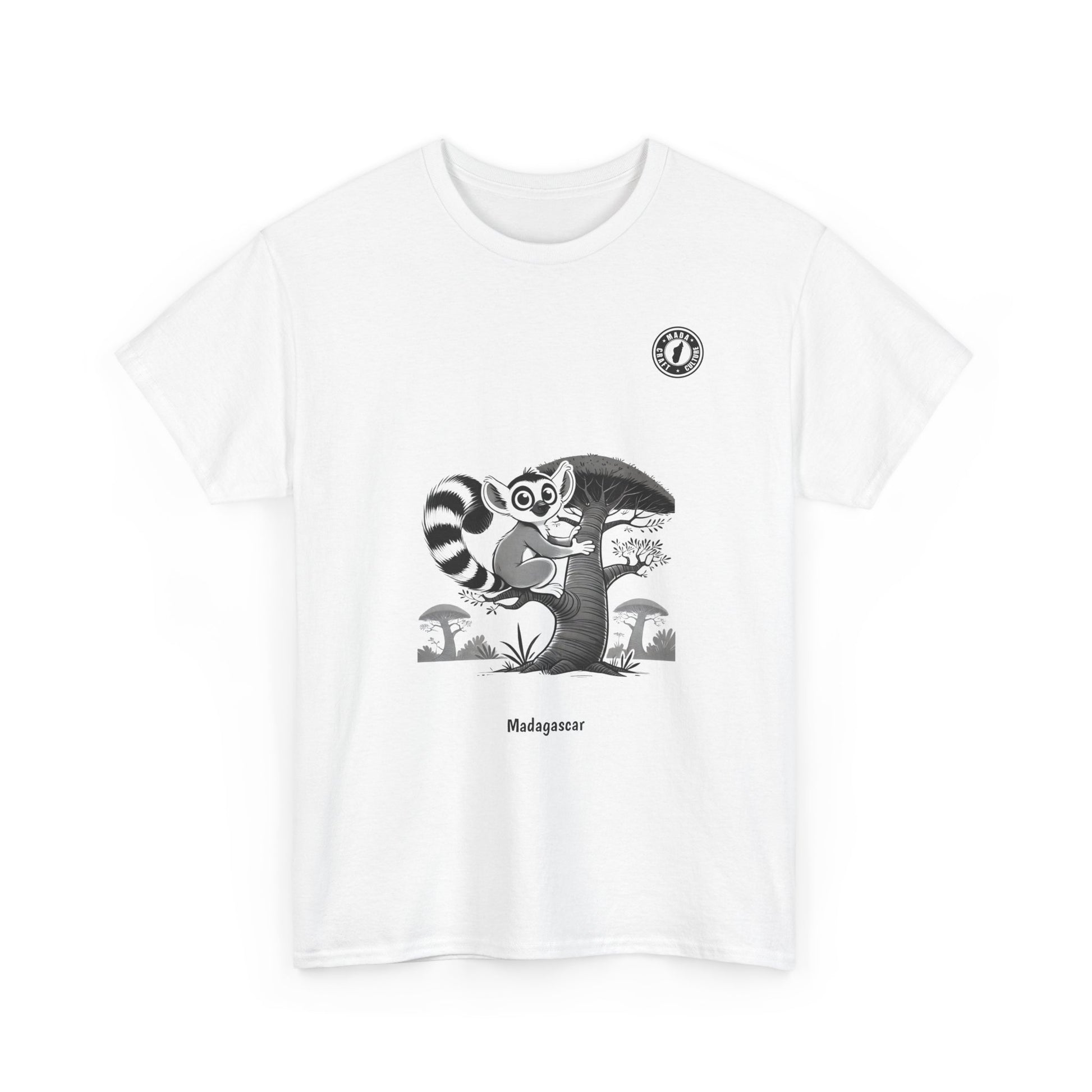 This t-shirt features an adorable lemur clinging to a majestic baobab tree, a minimalist illustration that captures the essence of Madagascar with tenderness and originality. A perfect style for those who love nature and elegant designs with exotic touches.
