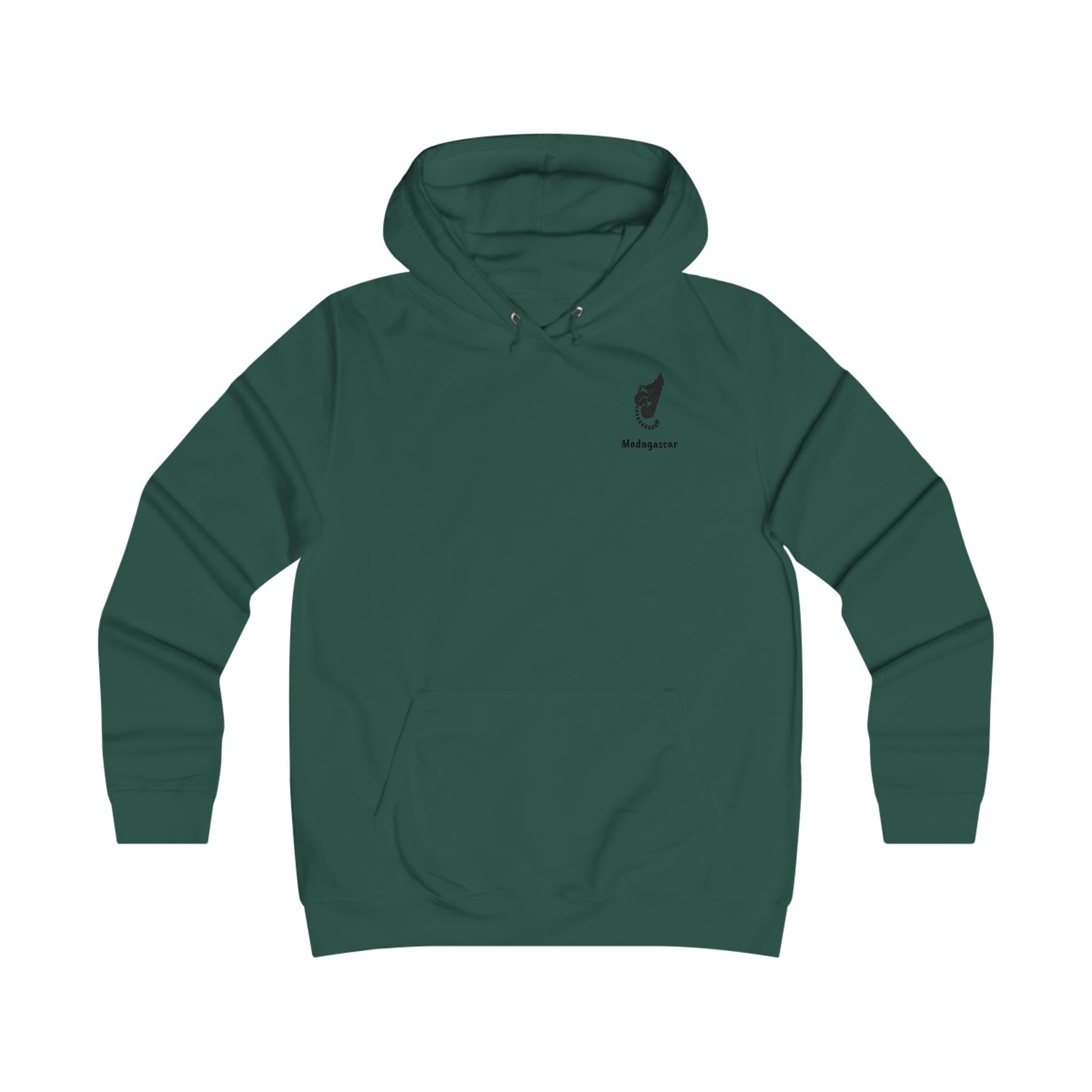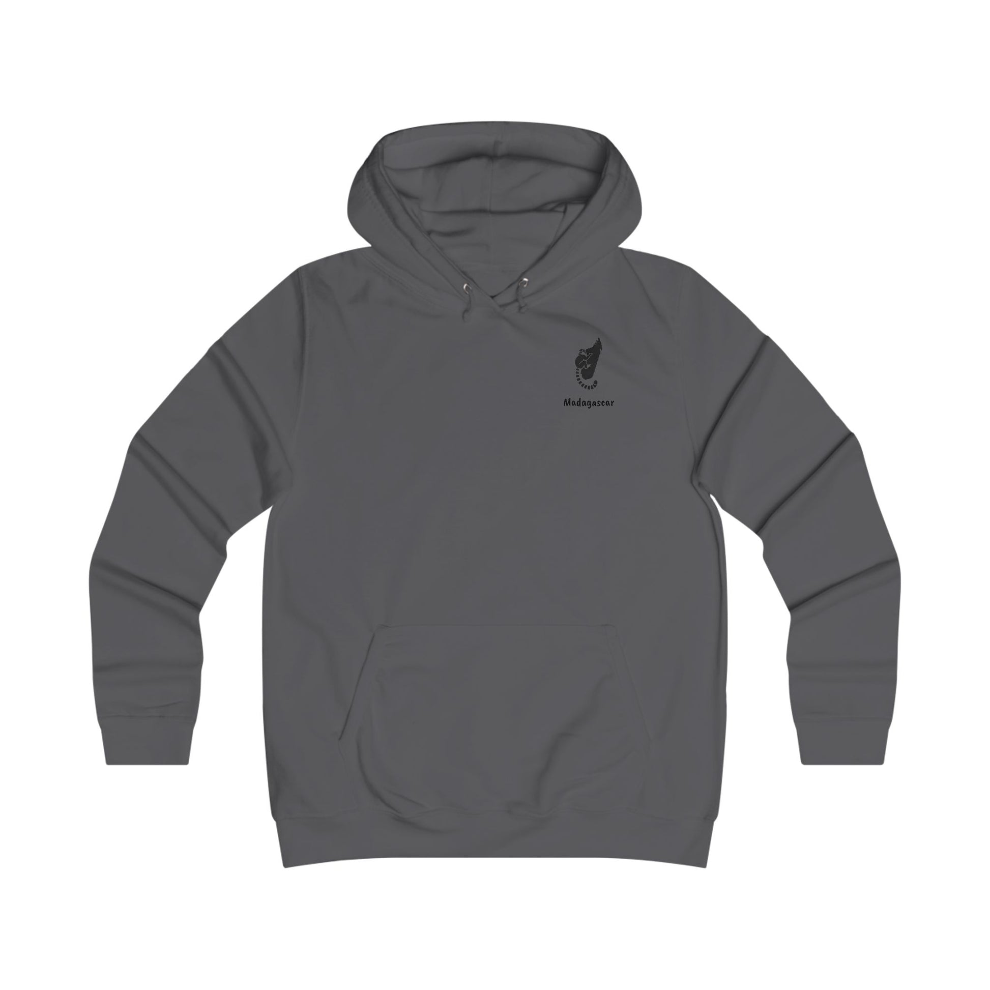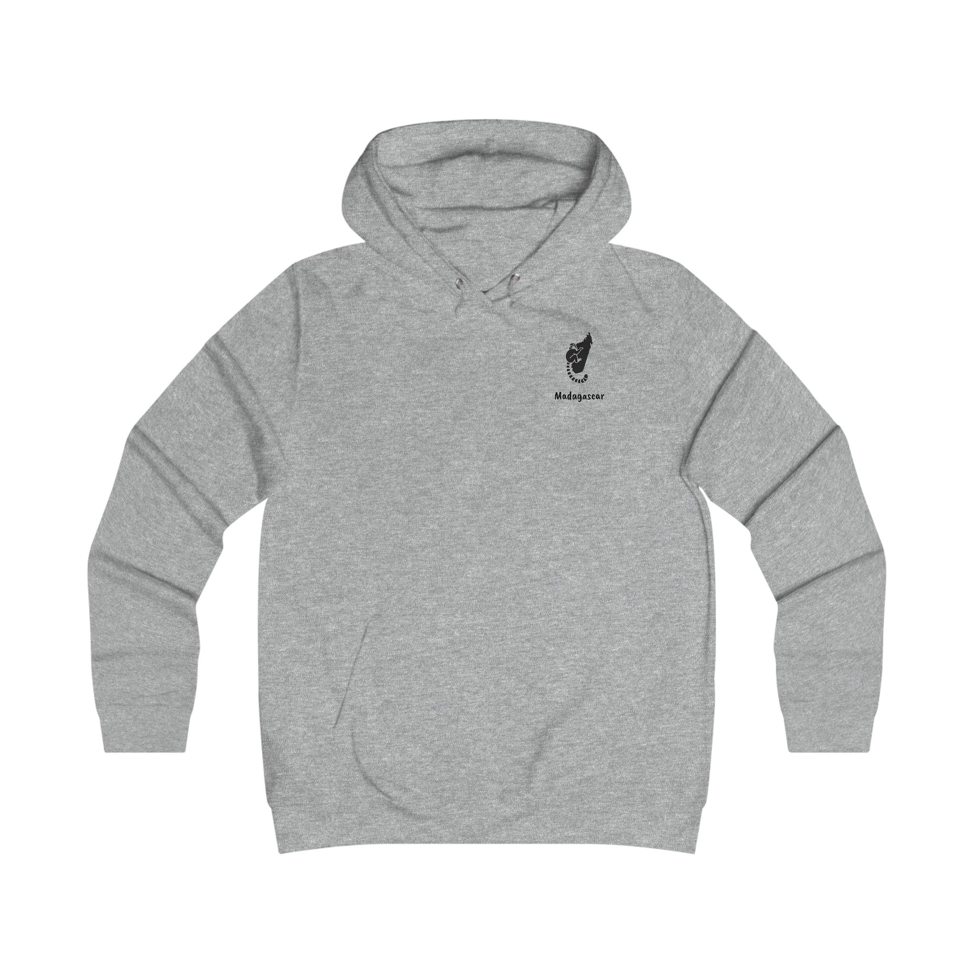 This women's hoodie proudly displays an elegant silhouette of Madagascar, featuring a ring-tailed lemur , an iconic emblem of Malagasy wildlife. The image is placed over the heart on the front and prominently on the back, for a style that is both understated, assertive, and socially conscious.