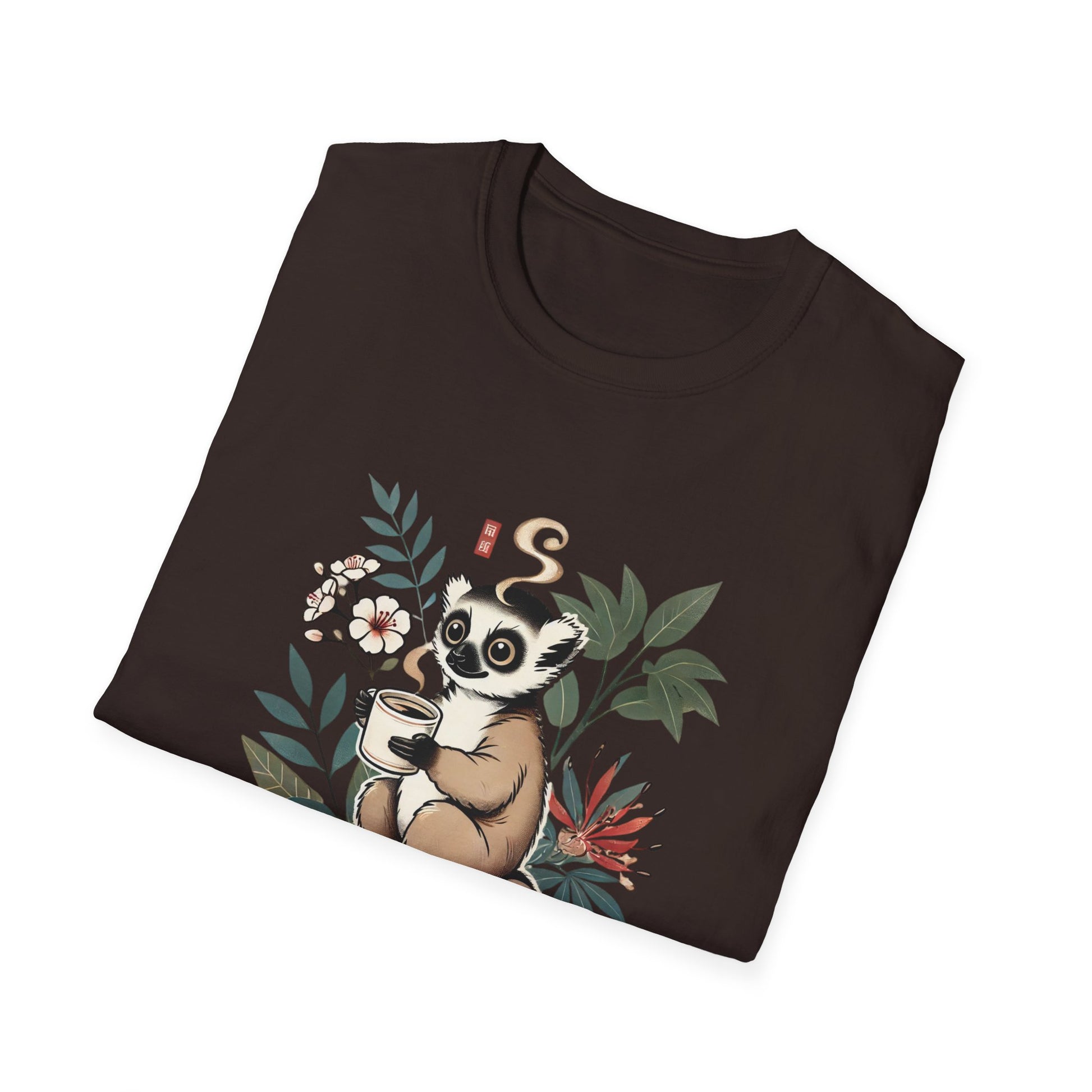 This t-shirt features a ring-tailed lemur , the emblem of Madagascar, enjoying a coffee break in a lush tropical setting. Its relaxing atmosphere, combined with the message "Zen Coffee," makes it the perfect garment to start the day with serenity.