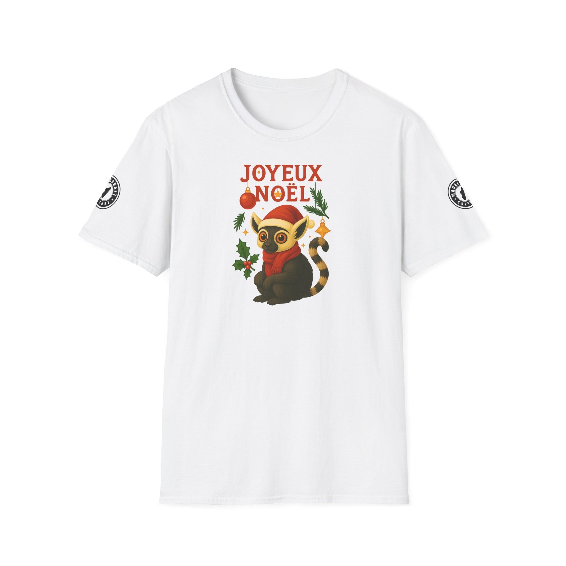 Un t-shirt doux et léger qui apporte une touche de charme festif au quotidien. Le motif représente un lémurien illustré portant une écharpe, entouré de houx et de décorations de Noël, avec l’inscription « Joyeux Noël » en lettres joyeuses au-dessus.